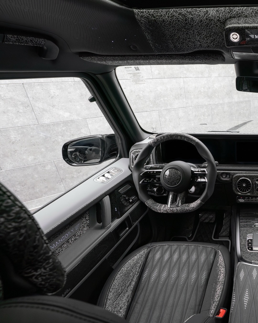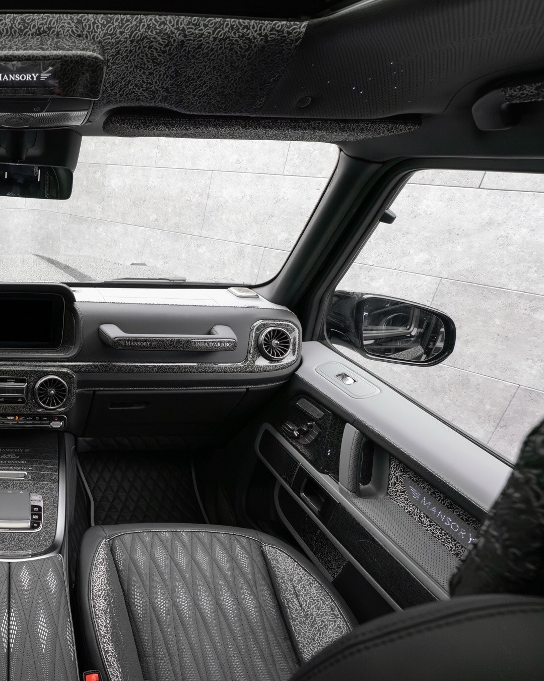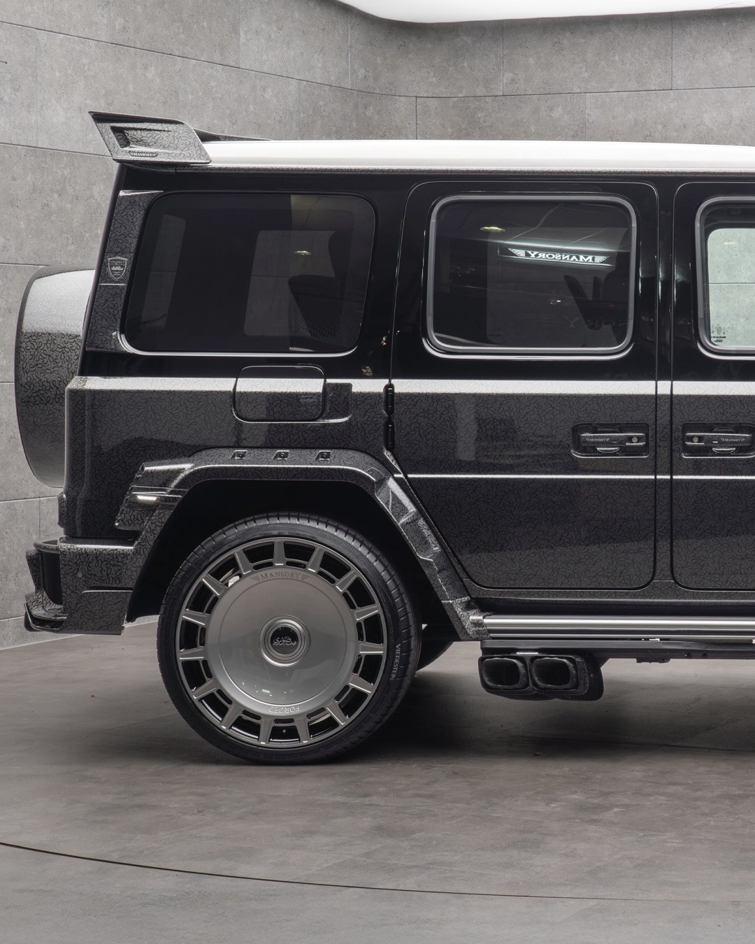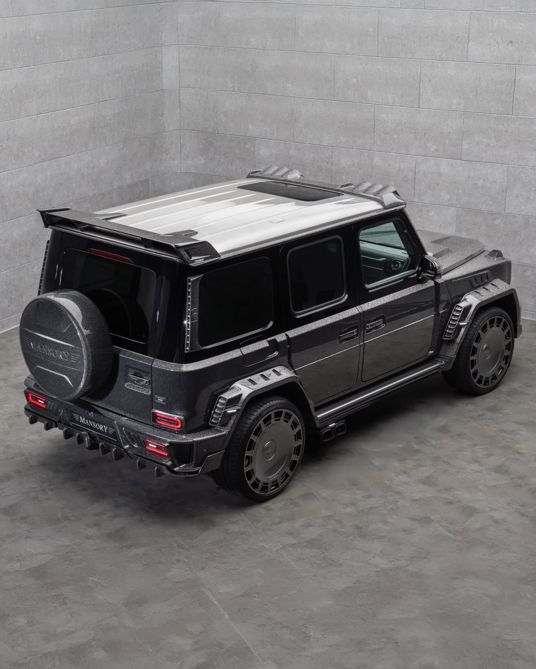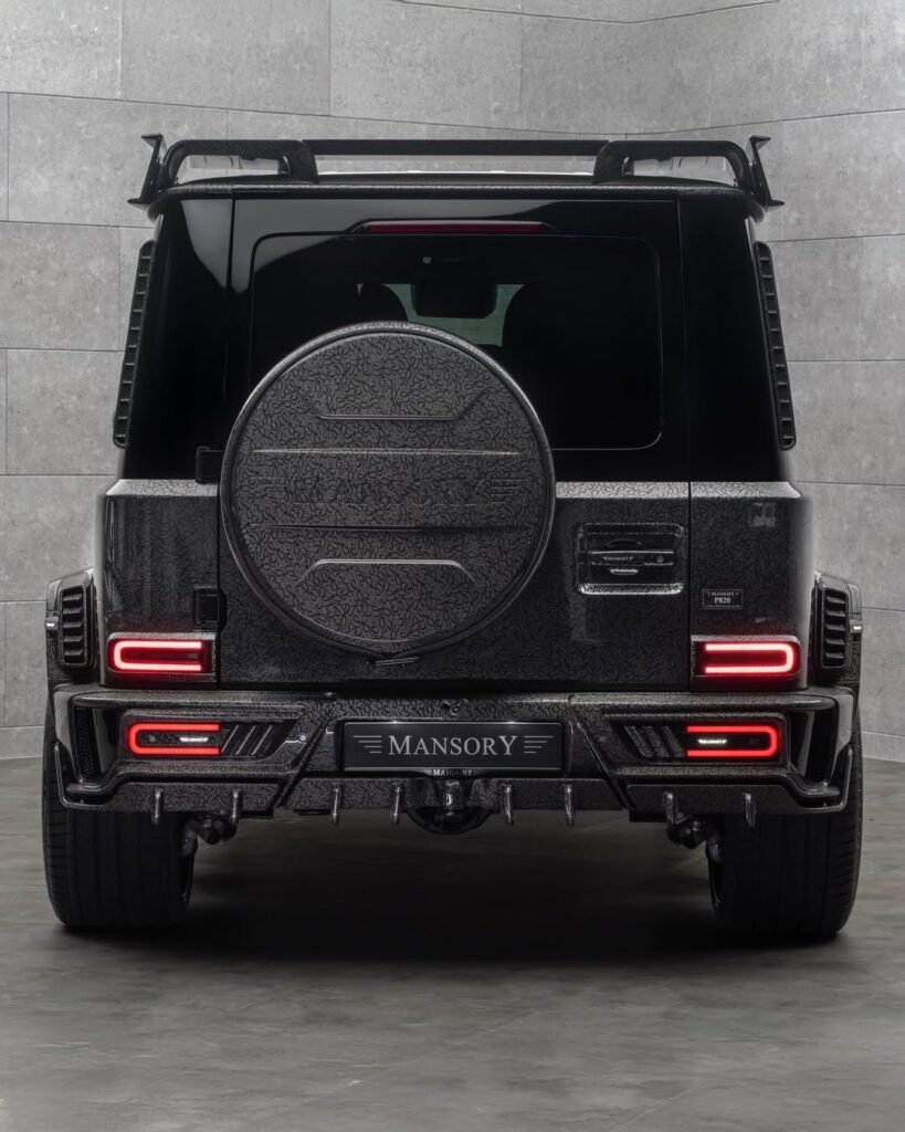 The rear receives just as much attention. Mansory added new trim to the rear pillars, unusual elements behind the rear wheel arches, and, because one set apparently was not enough, another pair of taillights. That extra-light treatment has become a familiar Mansory move on the G-Class. A custom rear bumper is part of the package too, joined by a multifunction diffuser, a reworked spare wheel holder, a roof wing, and new exhaust-tip trim.