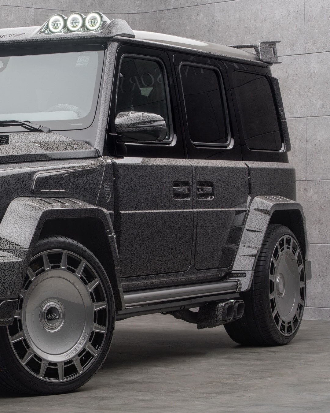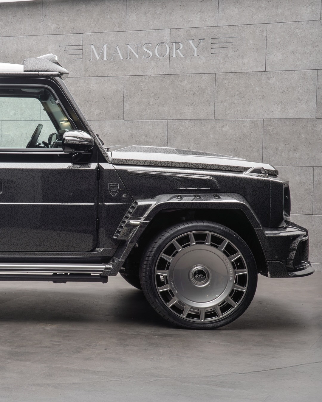 And yes, the rear suicide doors are here as well. They are matched with deployable side steps that light up to make getting in and out easier. The pictured SUV also rides on wheels that are typical of Mansory builds, and the whole thing wears a custom paint finish. Around back, a special plaque confirms both its new name and its status as a bespoke build.