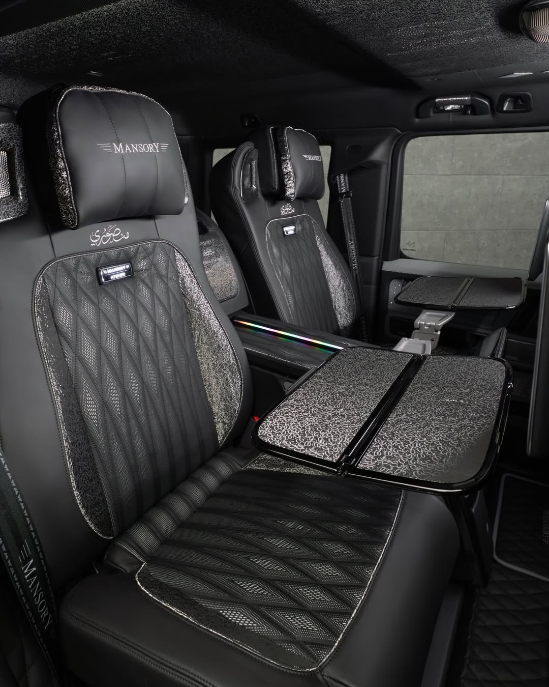 Inside, the tuner did not exactly hold back. The cabin gets new black leather upholstery, a different steering wheel, updated door cards, extra trim, pedals, floor mats, and Mansory logos spread throughout. Rear passengers are treated to two captain’s chairs and picnic tables, which is about as subtle as the exterior. Actually, no, less subtle.